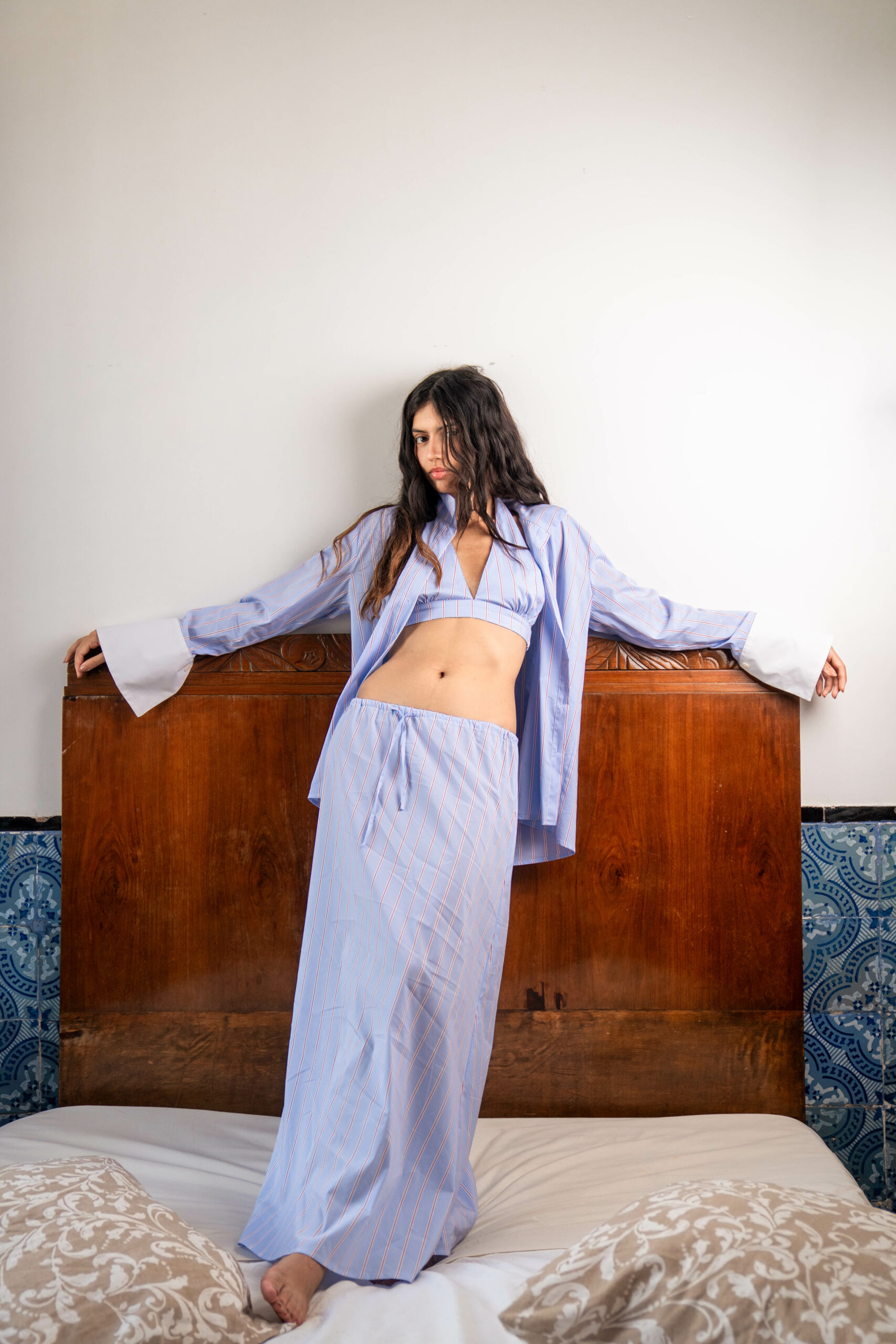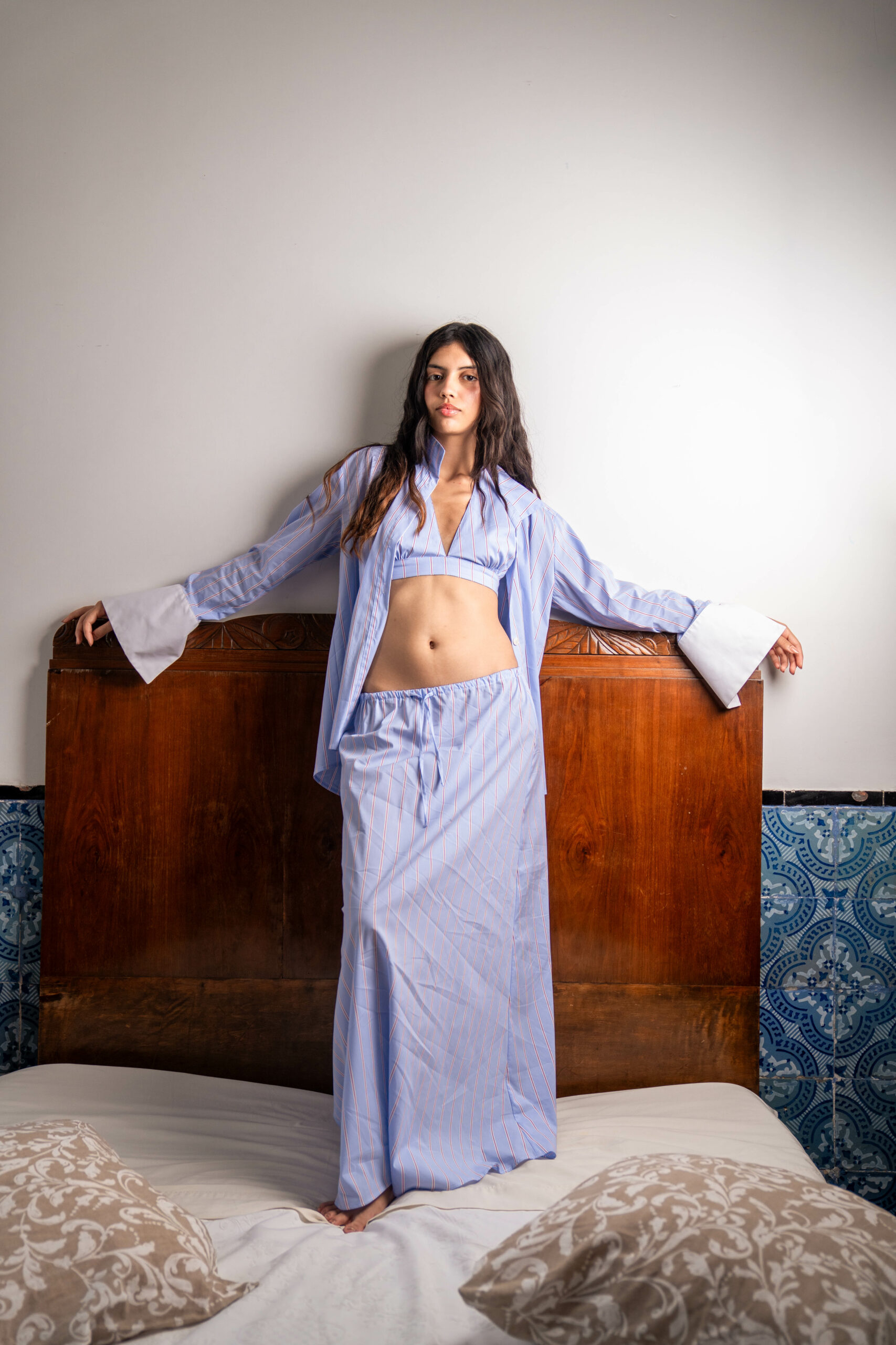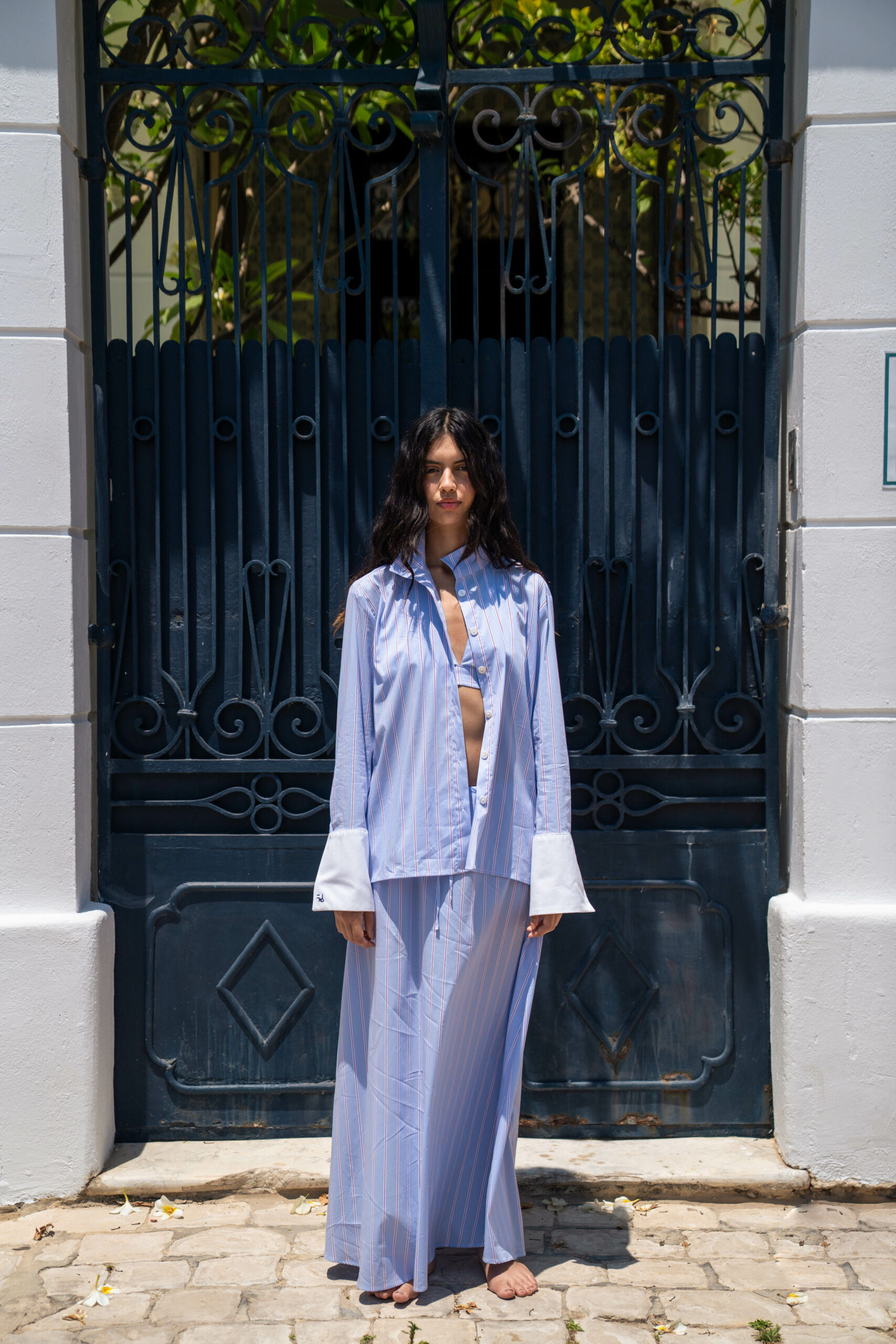 Coupe évasée en forme de A, ajustée à la taille et s’élargissant vers l’ourlet,Taille haute avec ceinture élastiquée ajustable,Longueur longue pour un porté élégant,Parfaite pour accompagner la chemise FADILA assortie pour un look chic et harmonieux